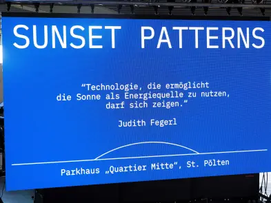 Judith Fegerl setzt mit sunset patterns die Geschichte und Gestaltung von photovoltaischen Zellen und Modulen in den Fokus. Die Grafiken für das Werk sind inspiriert von historischen Solarpaneelen unterschiedlicher Architektur, Oberflächen und Materialien und stark vergrößert patchworkartig an der Fassade des Parkhauses angebracht. Indem Fegerl Photovoltaik bewusst abseits des Effizienz-Aspekts thematisiert, stößt die Künstlerin so mit ihrer Arbeit eine Reflexion über die Ästhetik des Nützlichen, die Verfügbarkeit und den Umgang mit Energie und Ressourcen an. Die Positionierung des Kunstprojekts auf dem Parkhaus zeigt zudem den Widerspruch zwischen den thematisierten Klimazielen und der CO2 produzierenden Individualmobilität auf. Judith Fegerl war es wichtig, mit ihrem Werk über die Gestaltung hinaus zu denken und dieses an die Errichtung einer Solaranlage zu koppeln. Weitere Infos zum Kunstprojekt: www.sunsetpatterns.at