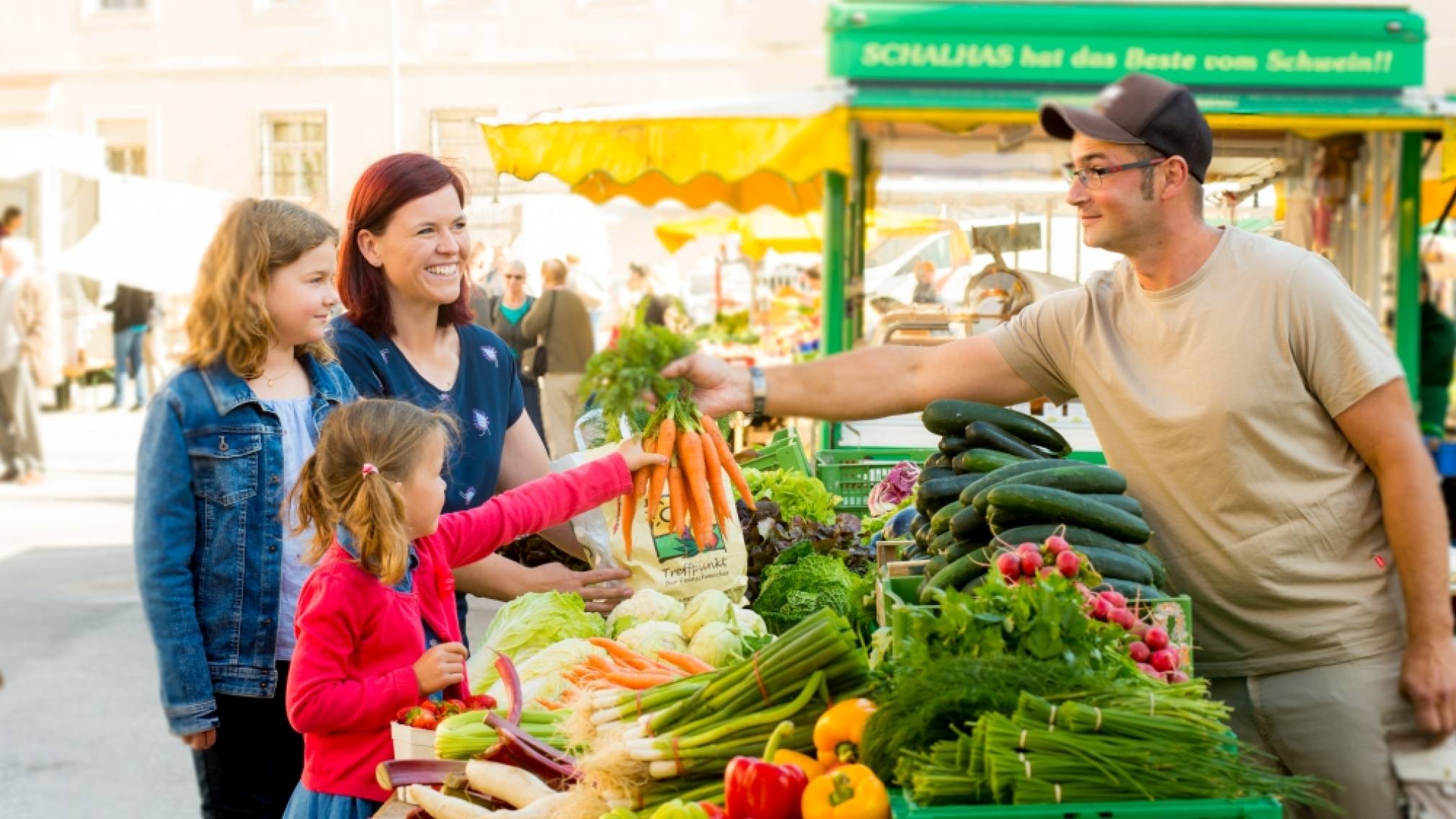 Jetzt, im Sommer leuchten rote Paradeiser von den Standln am Wochenmarkt, es gibt frisches Obst, duftende Mehlspeisen, würzigen Käse, schmackhaftes Bauernbrot, ausgezeichnete Fleischwaren und Fisch. Aber auch Säfte, Wein, Bier sowie Sauergemüse, Marmeladen und vieles mehr an saisonalen und regionalen Produkten kann hier gekauft und verkostet werden. All diese Köstlichkeiten sind in der Umgebung der Stadt gewachsen, viele dieser Lebensmittel sind biologisch zertifiziert.