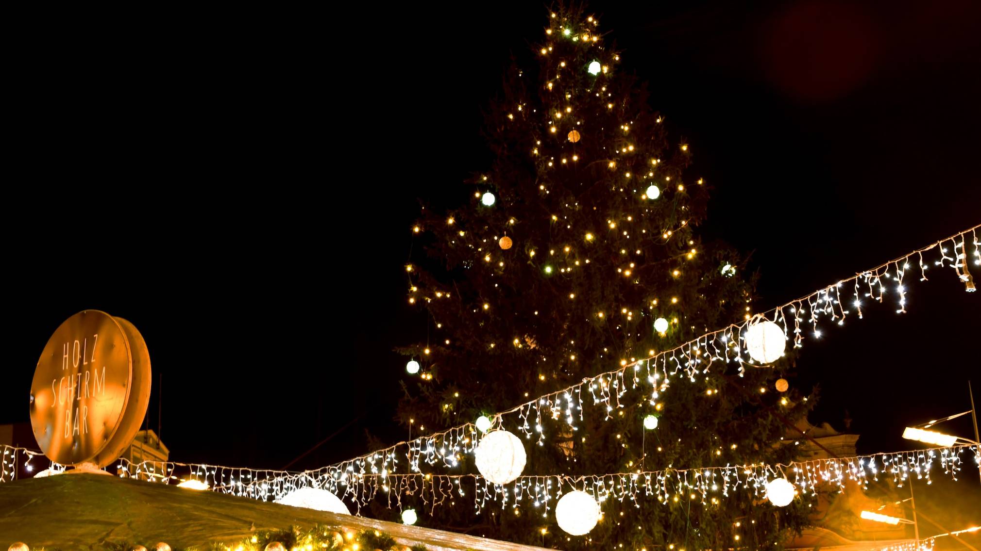 Ich starte beim Rathaus, es ist schon finster, die Rathausuhr zeigt 17 Uhr, und ich schlendere über den Weihnachtsmarkt in Richtung Franziskaner-Kirche. Die vielen unterschiedlichen Hütten sind heimelig beleuchtet, Menschen stehen in kleinen Gruppen beisammen, wärmende Getränke in den Händen, immer wieder flitzen ein paar Kinder laut kichernd an mir vorbei, zwei Mal, drei Mal, immer im Kreis um die Dreifaltigkeitssäule und den festlich beleuchteten Weihnachtsbaum herum. Ich bleibe stehen, gehe ein paar Schritte zurück, stelle mich vor den Baum, und lege den Kopf in den Nacken. Ein paar Minuten lang stehe ich nur so da, mache nichts anderes, als den Baum, die Lichter, die Gerüche und Geräusche um mich herum wahrzunehmen, das helle, immer wiederkehrende Kinderlachen. Und mit einem Mal legt sich dann ein sanftes Lächeln auf meine Lippen, und es macht sich ein warmes Gefühl in meinem Bauch breit, obwohl das Wetter nass-kalt ist, und ein eisiger Wind weht.