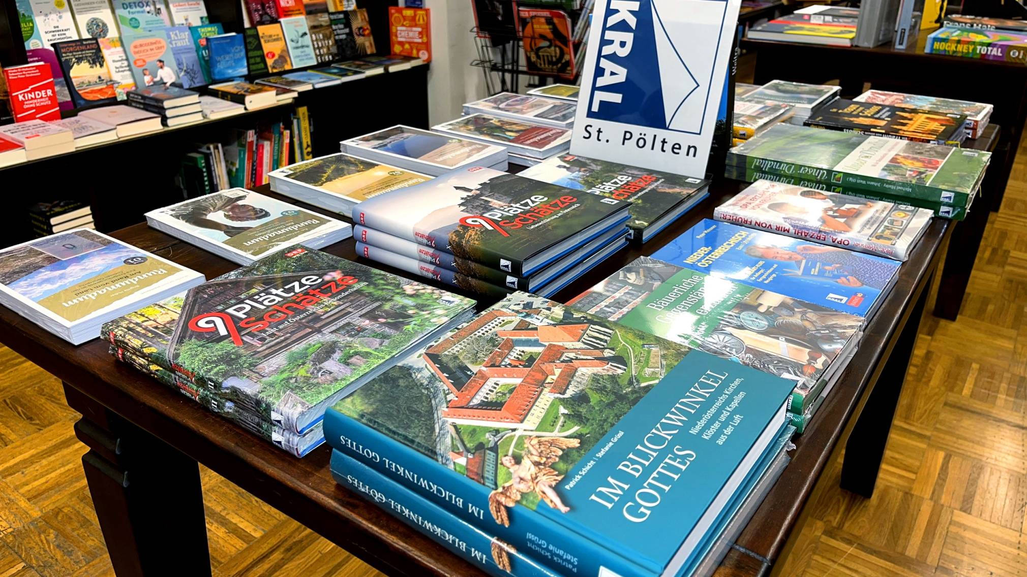 Bislang gab es in der Buchhandlung Kral (ehemals Schubert) immer nur temporär bestimmte regionale Schwerpunktsetzungen, meist entlang von Freizeitmöglichkeiten in den verschiedenen Jahreszeiten oder lokaler Sehenswürdigkeiten. Wanderführer, Bücher über Outdoor-Aktivitäten, die schönsten Kirchen Niederösterreichs, all das, was nach der Erfahrung des Personals von den Stammkunden gerne gewünscht war. Jetzt, durch das zum Teil regional fokussierte Programm des Kral-Verlages, wird hier ein stärkerer Akzent gesetzt: "Der Kral-Verlag ist da sehr flexibel in seiner Gestaltung, und auch offen, wenn zum Beispiel ein interessantes Thema, oder auch ein Gebäude, eine Geschichte zu erzählen hat, und sich anschließend auch ein Autor / eine Autorin findet, der / die sich damit auskennt, dann wird das durchaus mal auch entsprechend umgesetzt."
