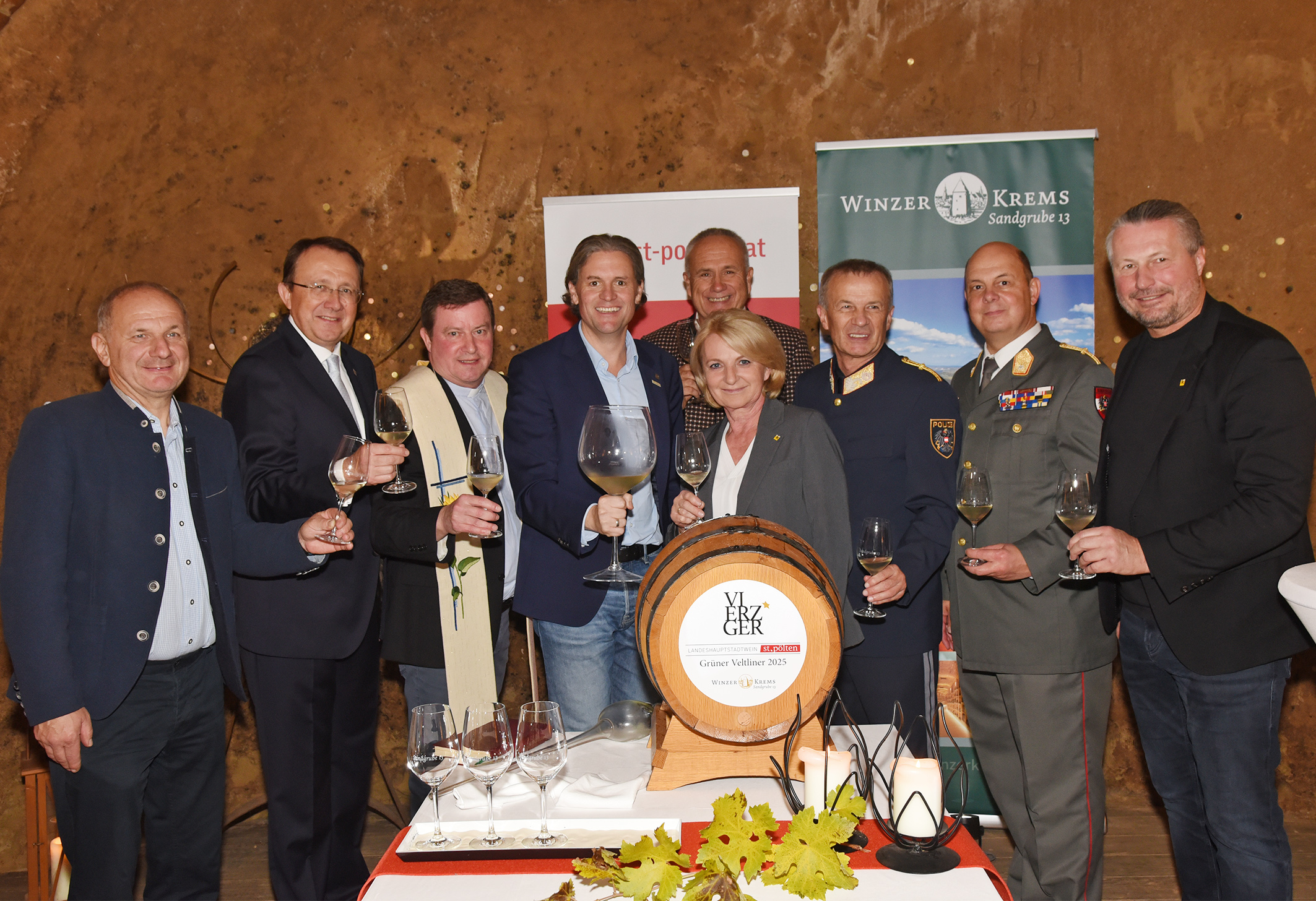 Im Rahmen der Weintaufe mit Bürgermeister Matthias Stadler und seinem Kremser Amtskollegen Peter Molnar, Vizebürgermeisterin Eva Hollerer aus Krems, Landespolizeikommandant Franz Popp und Militärkommandant von Niederösterreich Georg Härtinger, sowie Weinpate Dominik Mesner und Ludwig Holzer und Florian Stöger von den Winzern Krems führte der Kremser Stadtpfarrer Franz Richter die Weinsegnung in der Sandgrube 13 durch. (Foto: Vorlaufer)