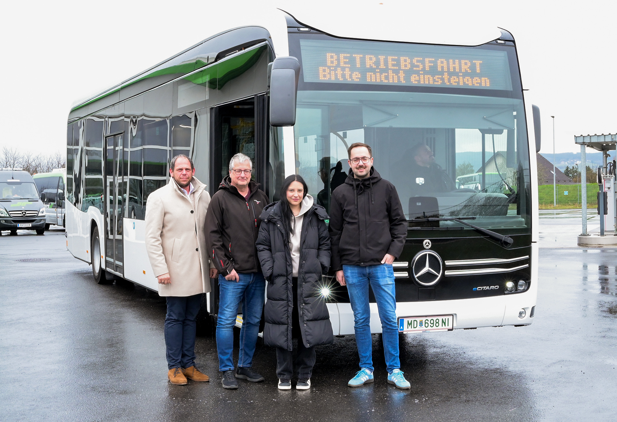 Rene Weihs (Projektleiter E-Mobilität Dr. Richard), LUP-Beauftragter Peter Zuser, Nadin Kranabetter von der Stadtplanung und Vizebürgermeister Michael Kögl testeten bereits eines der eCitaro-Modelle von Daimler. (Foto: Josef Vorlaufer)