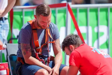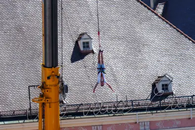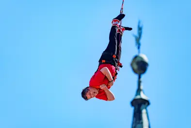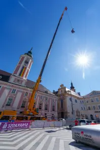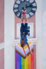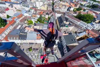 Auf Augenhöhe mit dem Rathaus-Glockenspiel wurde am 29. Juni in Kooperation zwischen der Marketing St. Pölten GmbH, der Plattform St. Pölten und Bungee-Profi Rupert Hirner etwas ganz besonderes Angeboten: Ein Sprung aus 65 Metern Höhe.